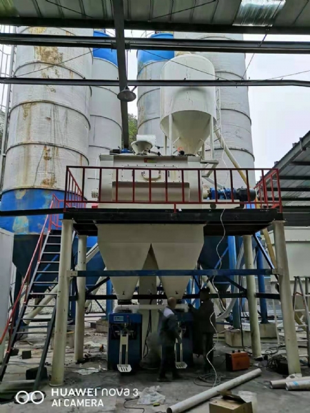 該型號設備由原料倉、輸送螺旋、配料秤、斗式提升機、雙軸無重力混合機、主機平臺、成品倉、自動包裝機、除塵器等組成。主要用于生產(chǎn)石膏砂漿、抹灰石膏砂漿等產(chǎn)品。